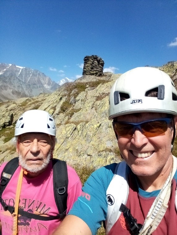 Comme on n’est visiblement pas fatigué (erreur de jugement classique), on décide de grimper jusqu’à la Grande Chenalette. Le sentier ? Échelles, câbles, ambiance via ferrata version vintage. On passe devant l’arrivée de l’ancien télésiège de la Chenalette (paix à son âme, 1954–1986), puis on atteint le sommet à 2889 m. Là-haut, vue à 360° : Grandes Jorasses, Mont-Blanc, Grand-Combin, Mont Vélan et ciel de magazine.  On repère la voie de demain (la Drônalette), puis on redescend.