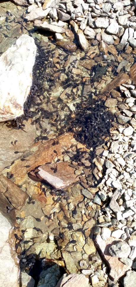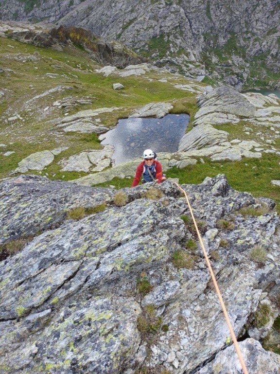 Cap ensuite sur le col du Grand-Saint-Bernard. Petit pique-nique au bord du lac (le saucisson a failli tomber dans l’eau, mais a été sauvé in extremis), puis on part vers la fameuse voie « Confiance aux têtards ». 6 longueurs, 4c max, 4a obligatoire. Le nom inspire… un peu trop de confiance peut-être. Bonne surprise : rocher sec, adhérence au top, panorama de carte postale. On grimpe tranquille, comme des bouquetins zen, jusqu’au plateau… où les vrais maîtres des lieux nous attendent : une armée de têtards en pleine rave-party aquatique. C’est leur fête, on s’incline.
