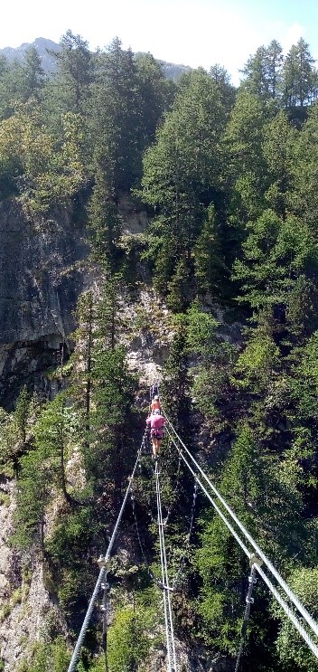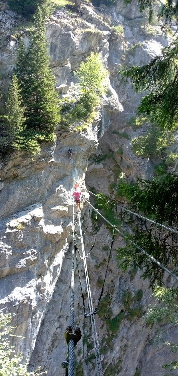 De ce fait nous descendons à Sembrancher puis remontons le Val de Bagnes jusqu’au lieu-dit « La Vacheresse » deux kilomètres après Bonatchiesse. Du parking (gratuit) nous descendons en dix minutes au départ de la via ferrata « Saxifrage » qui longe la Dranse de Bagnes. C’est très joli avec un équipement parfait. Après une petite pause et une petite marche, nous attaquons la via ferrata « Tichodrome » un peu plus dans les bras et toujours au-dessus de la Dranse de Bagnes. Magnifique ferrata qui nous conduit directement sur la terrasse de l’Hôtel de Mauvoisin à 1841 m d’altitude. Nous avons parcouru toute la ferrata derrière un guide de la vallée et sa jolie cliente et nous allons nous désaltérer ensemble dans un petit coin au fond de la terrasse, tout est complet et réservé.