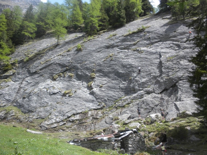 Première étape : les voies 3 (4b) et 4 (4c) en moulinette. Le rocher ? Un savant mélange entre savon de Marseille et carrelage de salle de bain mouillé. Un régal pour la confiance en soi. L’expression “prendre de la hauteur” prend ici un sens philosophique : on s’élève surtout spirituellement en affrontant ce rocher glissant.