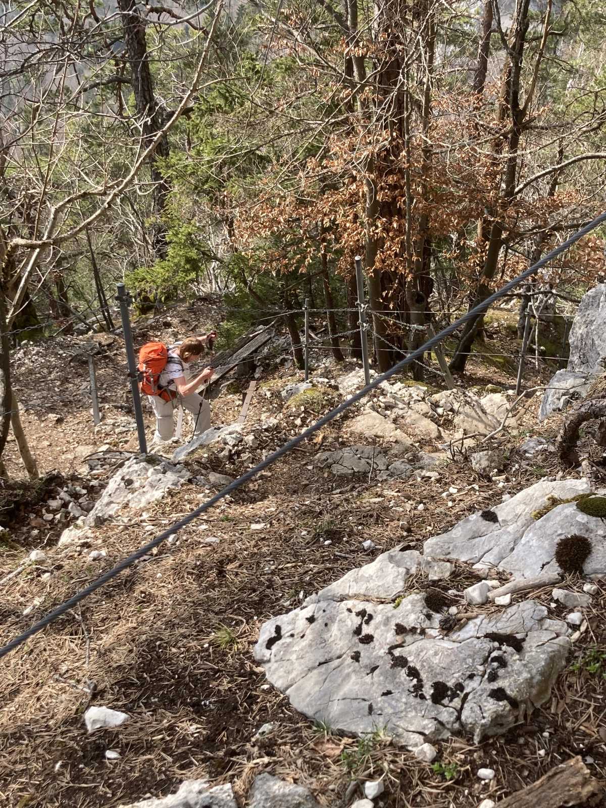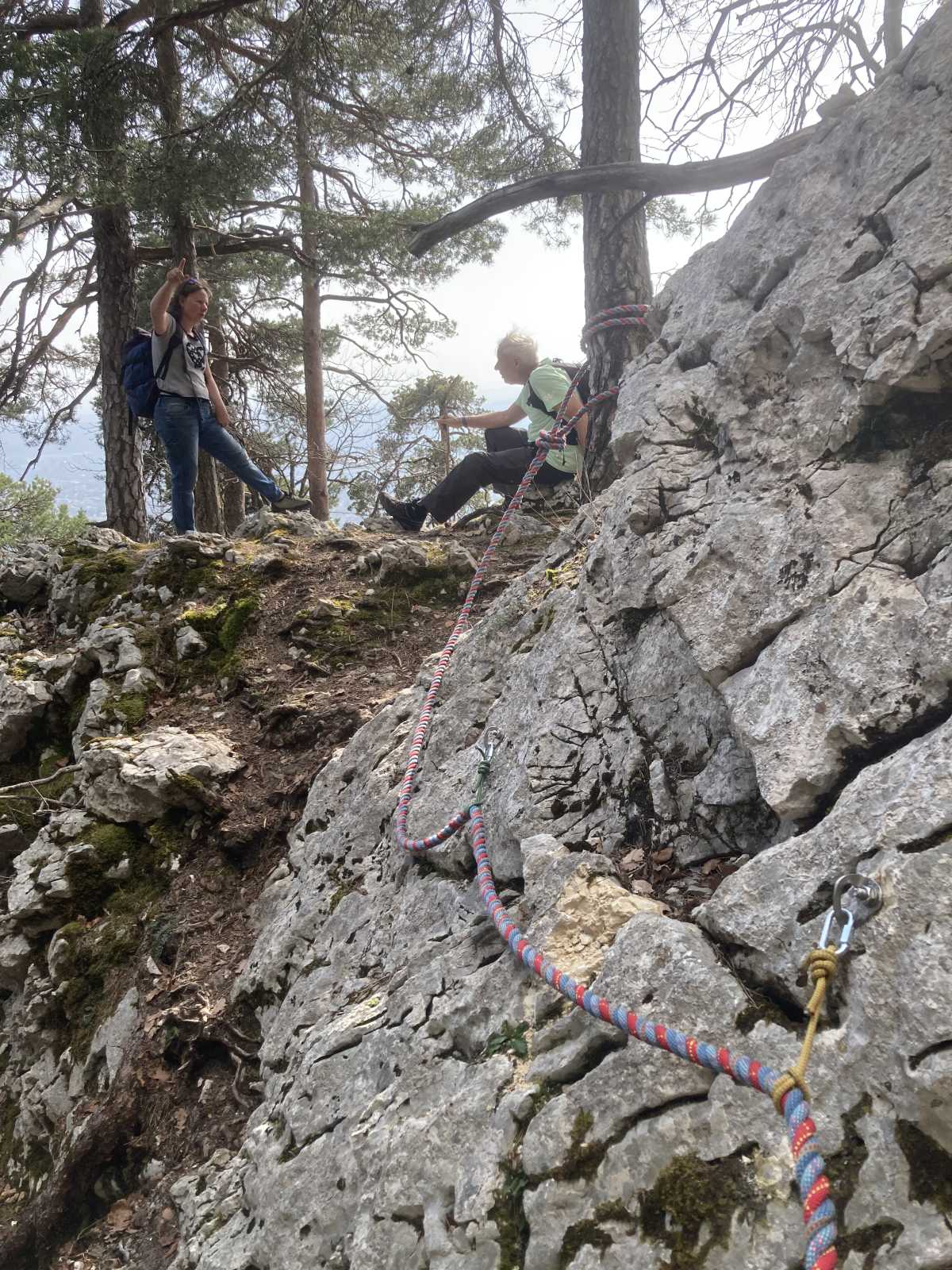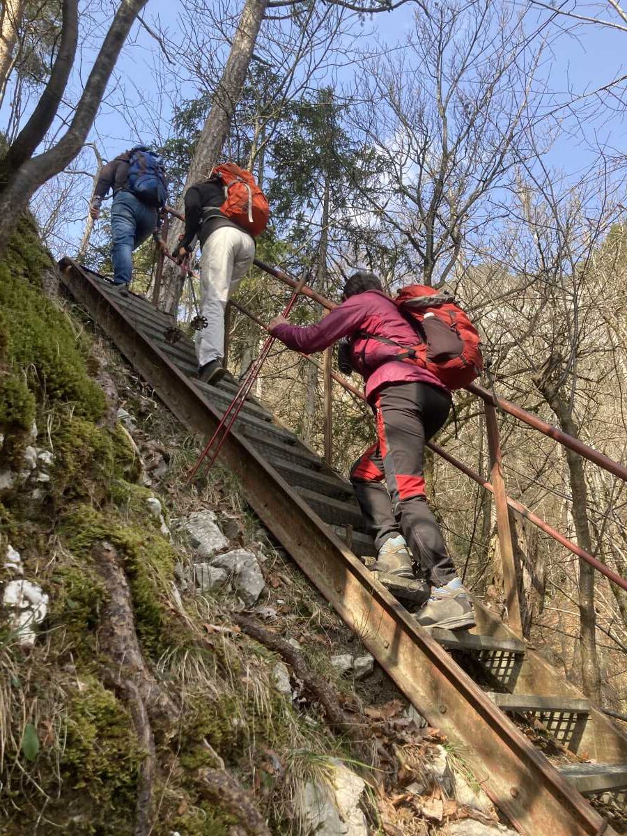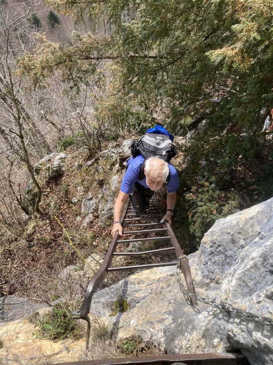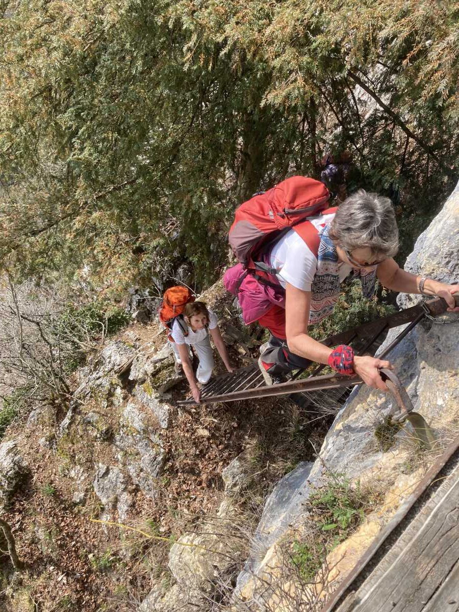 De là nous faisons un aller-retour par un petit sentier raide et assez expo (T4) pour visiter une petite grotte qui s’atteint par une vieille échelle métallique. C’est le Rundloch ! Au fond de la grotte il y a une table, une couverture et un tube de vaseline, ne manquent que les préservatifs !!