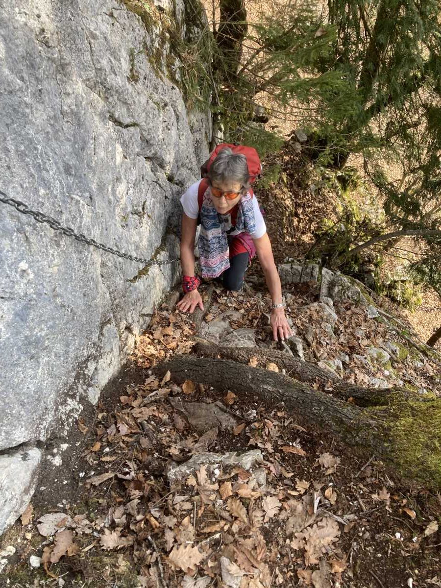 Mais revenons à nos moutons. Je démarre le sentier rouge en tête, suivi de Carine, mais aussitôt une randonneuse me talonne, je force mais elle me dépasse tout de même. Je m’accroche, suit une section très raide avec beaucoup d’escaliers et là, au prix d’un effort surhumain, je la redépasse. Satisfaction ! M’enfin ! Carine a assisté à la course elle rigole. Ce dimanche c’est la journée des femmes, mais tout de même un peu de respect pour les octogénaires de mon cru.