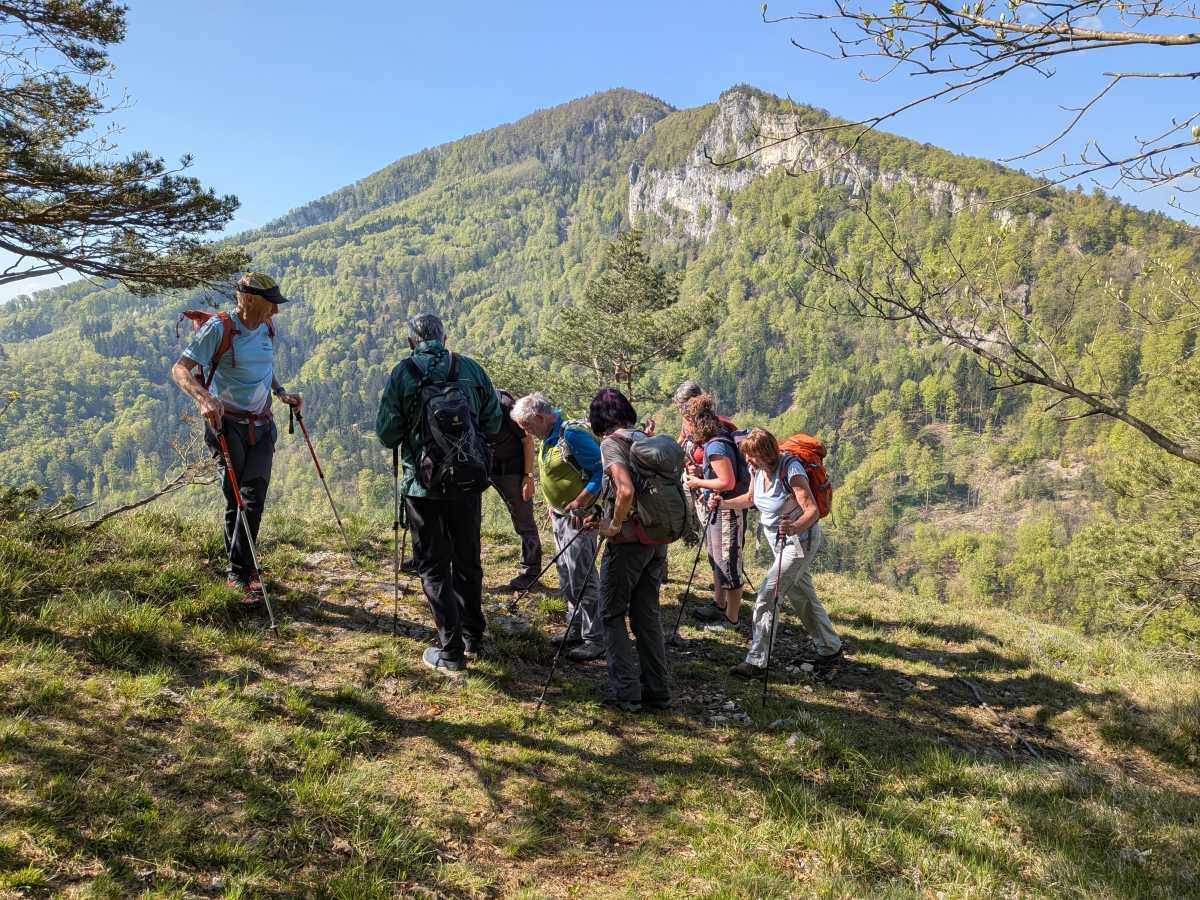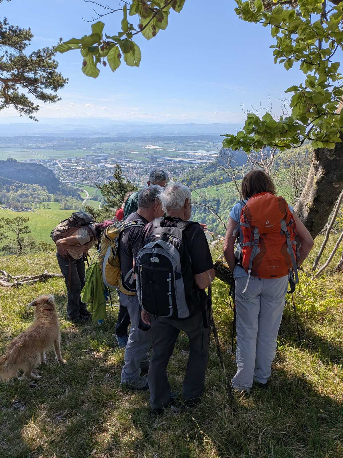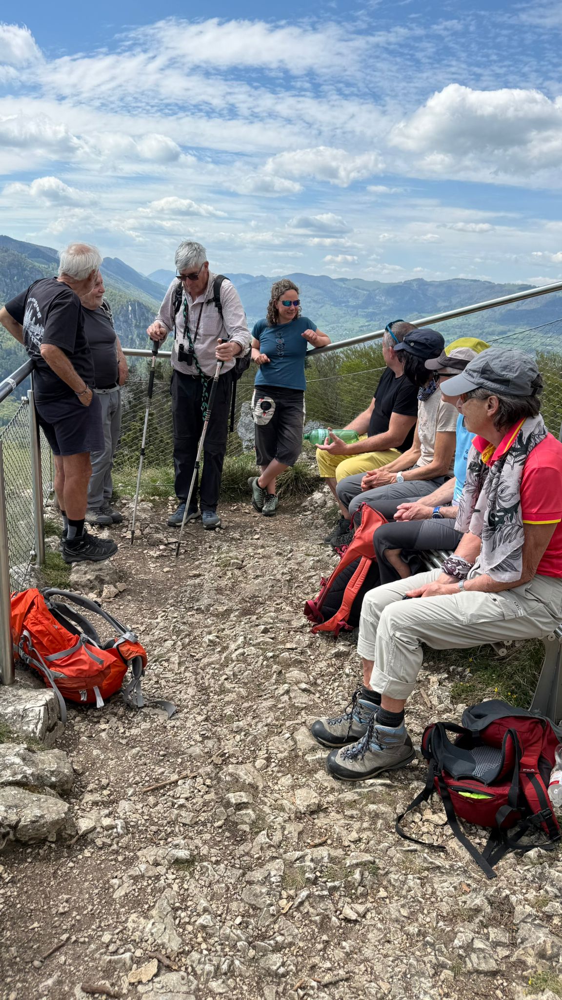 Ayant miraculeusement retrouvé le courage de continuer — probablement grâce au café — une grimpette supplémentaire a traîné ces 8 braves jusqu’au point de vue de la Roggenflue. De nouveau, la vue et l’ambiance ont retenu tout ce petit monde, officiellement pour « admirer le paysage », officieusement pour reprendre son souffle sans perdre la face. 😤🏔️