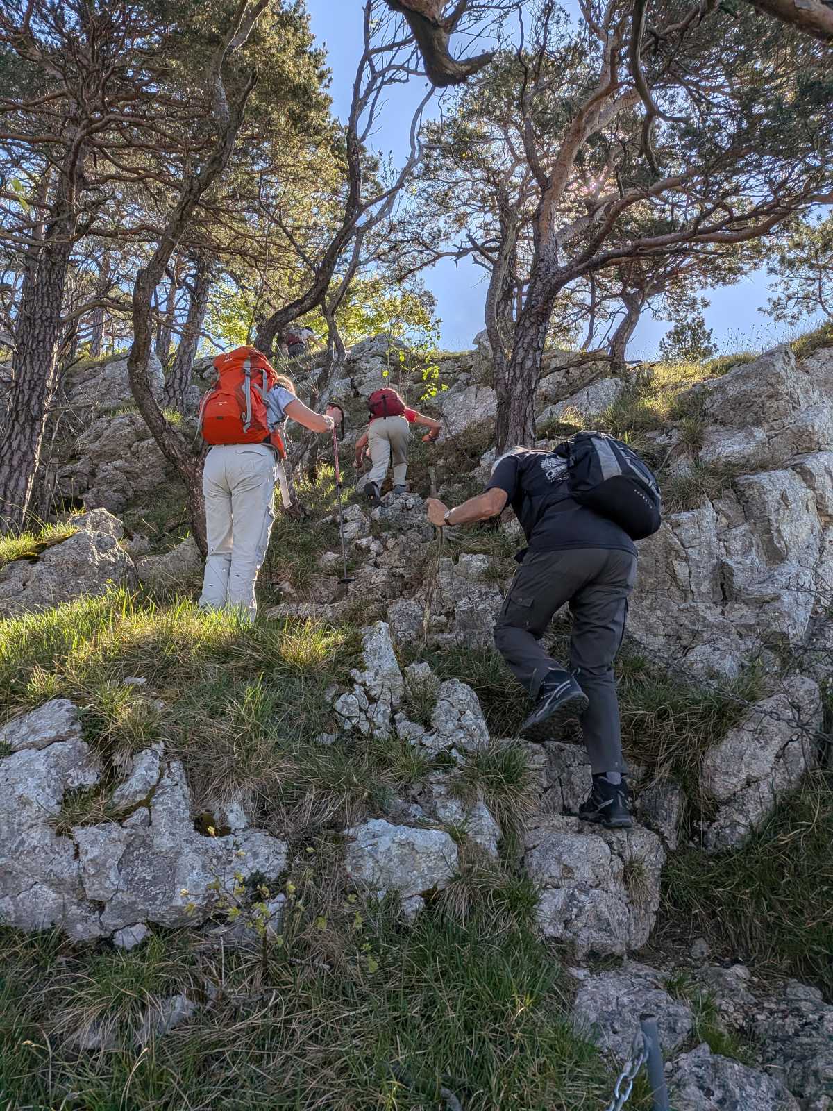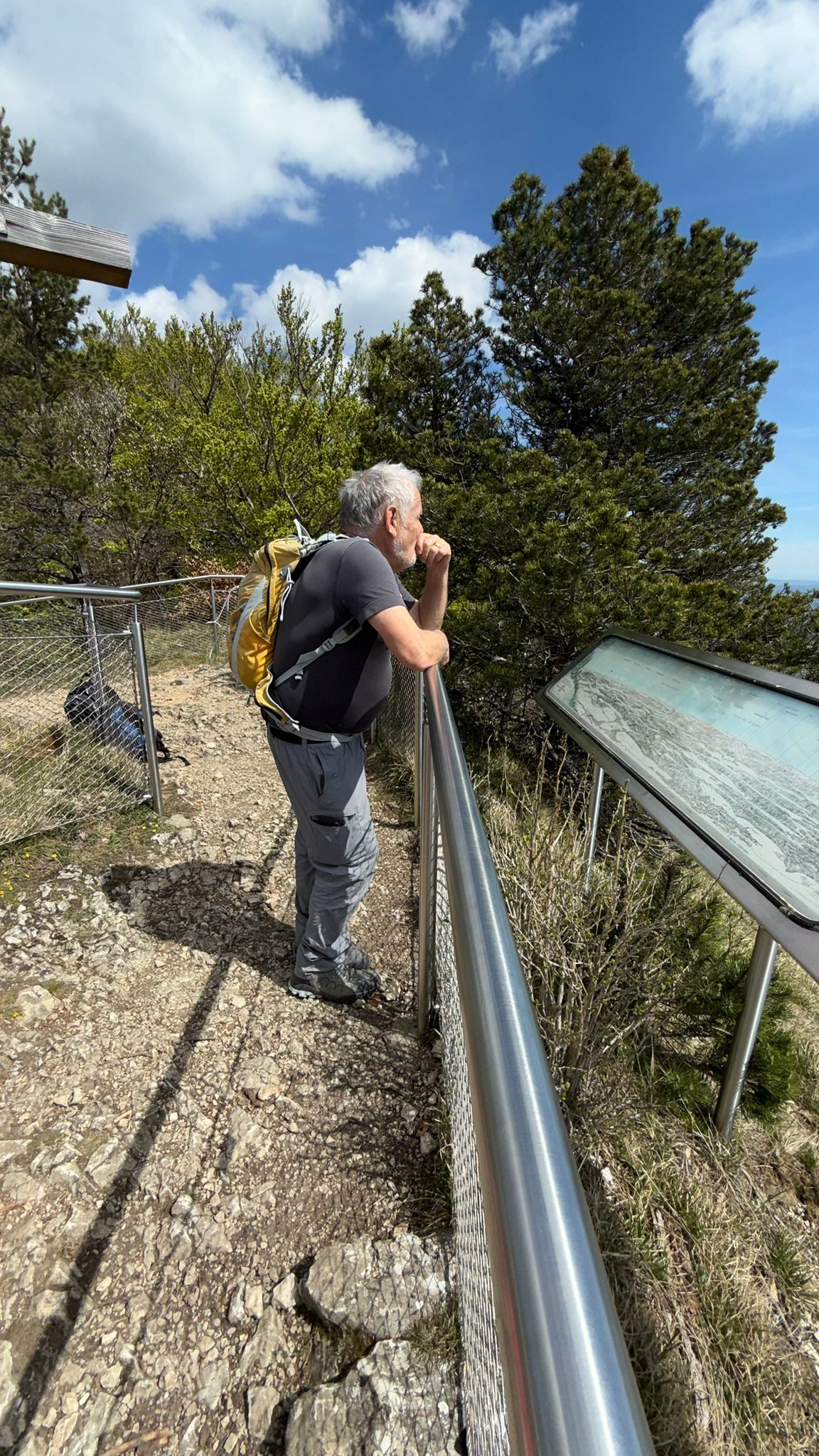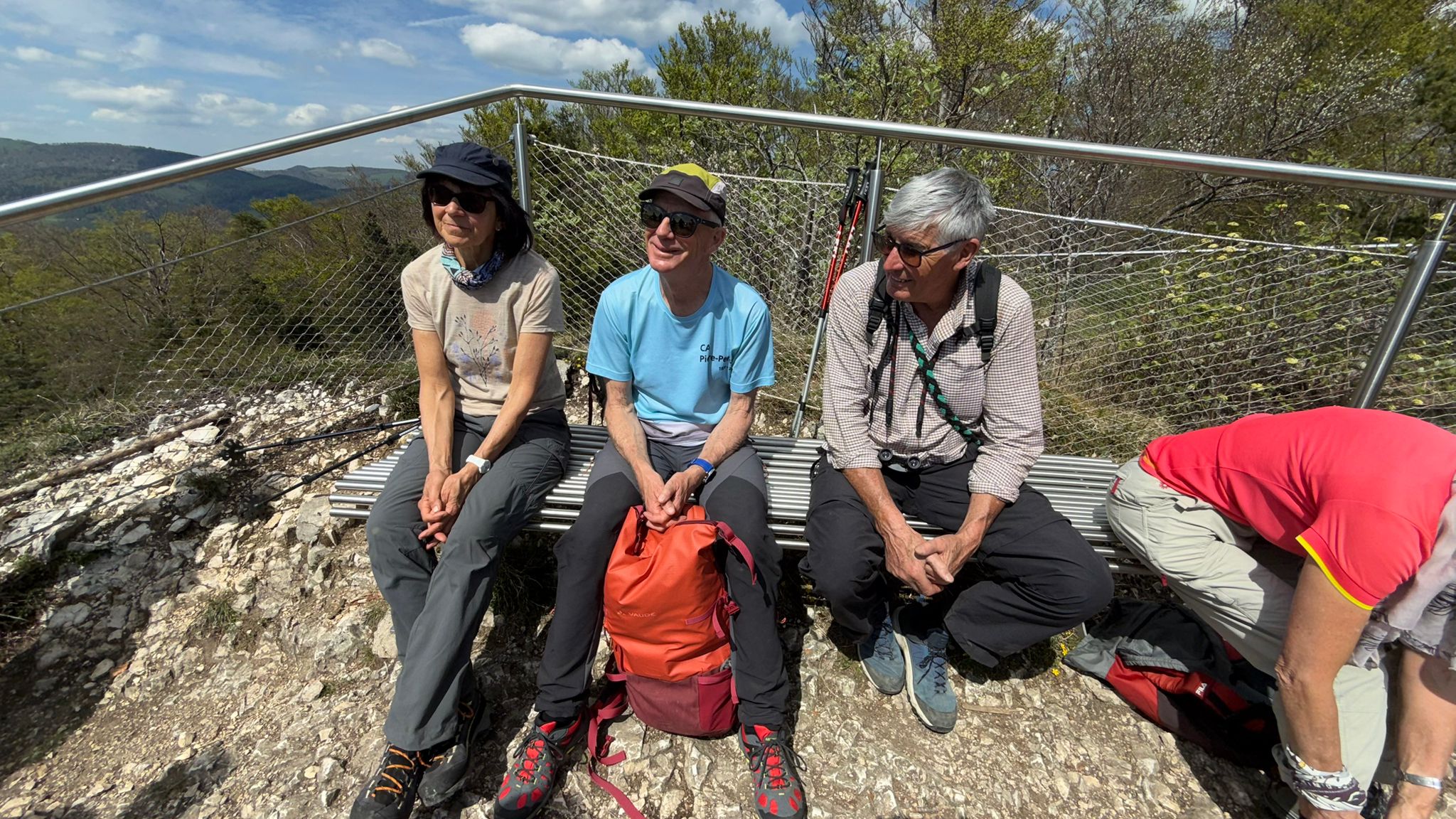 Ayant miraculeusement retrouvé le courage de continuer — probablement grâce au café — une grimpette supplémentaire a traîné ces 8 braves jusqu’au point de vue de la Roggenflue. De nouveau, la vue et l’ambiance ont retenu tout ce petit monde, officiellement pour « admirer le paysage », officieusement pour reprendre son souffle sans perdre la face. 😤🏔️