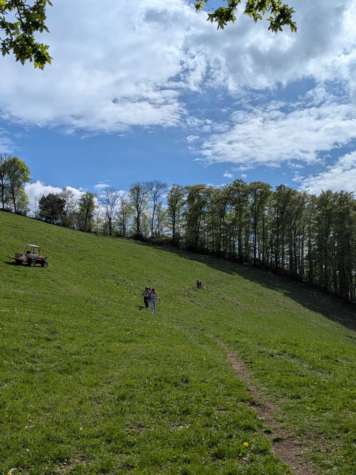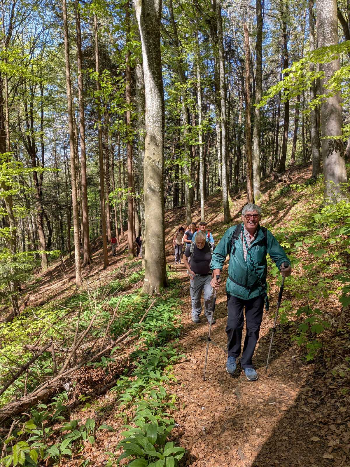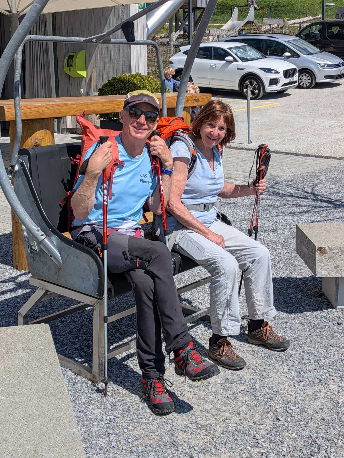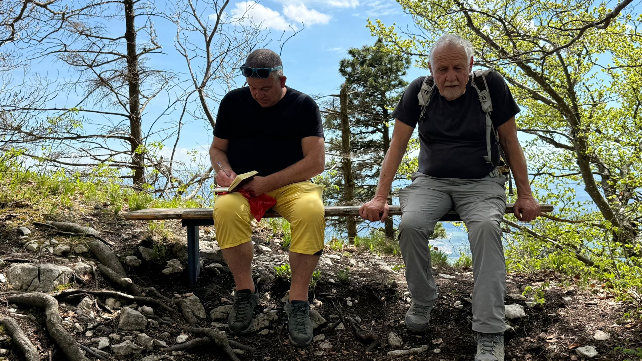 Ulrich, chef du jour, guide suprême et botaniste autoproclamé 🌿, a ensuite entraîné toute cette troupe vers une auberge de montagne pour le café et le dessert. Magnifique terrasse avec vue splendide sur le Plateau suisse et surtout sur l’autoroute, avec ses interminables colonnes de voitures entre Berne et Soleure. Moment de pur bonheur : être en haut à manger un gâteau pendant que des milliers d’automobilistes sont coincés en bas. La randonnée, c’est aussi ça : la Schadenfreude avec vue. 🚗🚗🚗😏