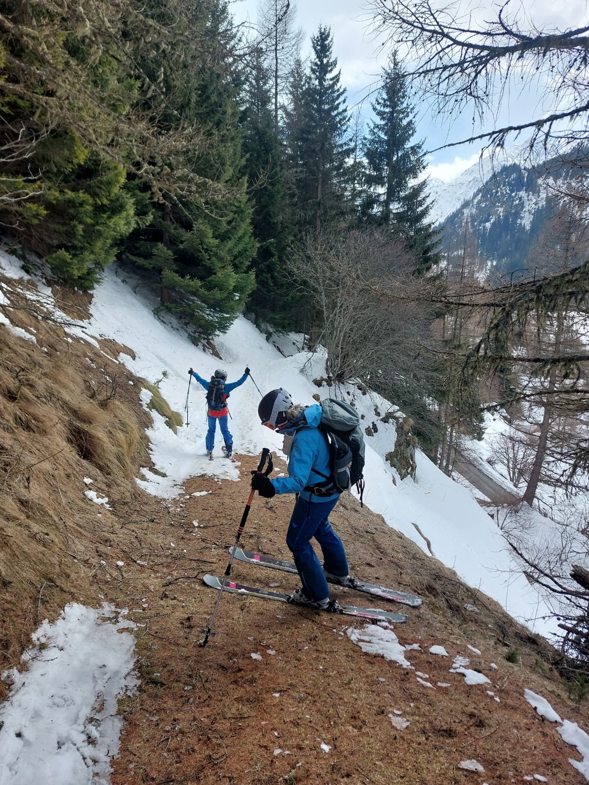 Entre deux sapins, nous apprenons les virages sautés en suivant les traces de Kathia, qui donne l’impression d’avoir fait ça avant de savoir marcher. Certains sautent avec style, d’autres avec courage, mais tout le monde progresse.