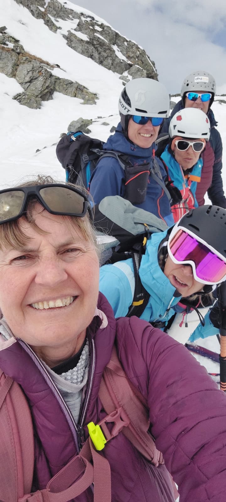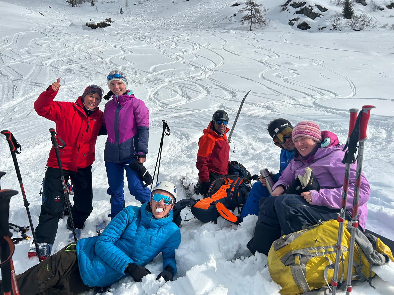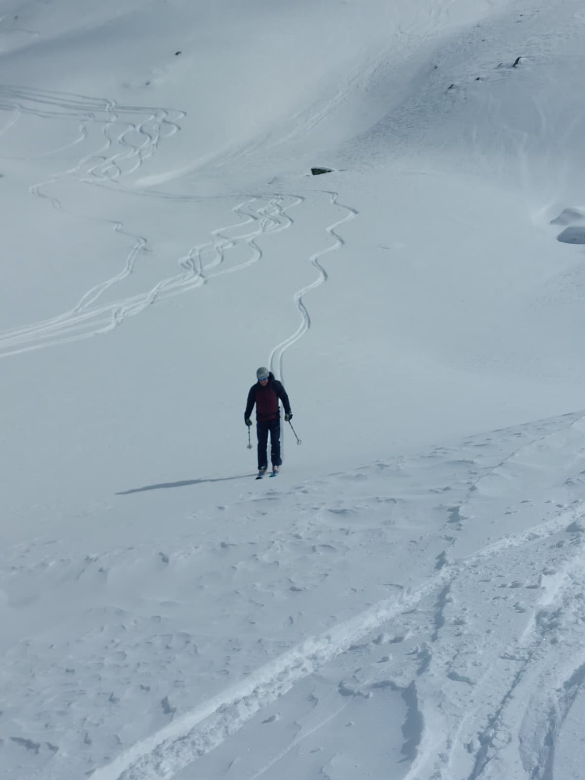 Le sommet du Beaufort est finalement atteint, bien mérité. On sort les thermos comme un trésor enfoui : le thé chaud coule , et soudain, tout le monde retrouve le moral et l’usage complet de ses jambes . Vient ensuite le moment de retirer les peaux… quand une fixation décide de nous rappeler qu’en montagne, rien n’est jamais totalement acquis. Heureusement, le télémark n’a aucun secret pour Daniel, qui transforme l’incident en démonstration improvisée. La descente se fait sur du carton, en compagnie de nos amis les « sharks », ces plaques de neige traîtres qui adorent tester notre équilibre.