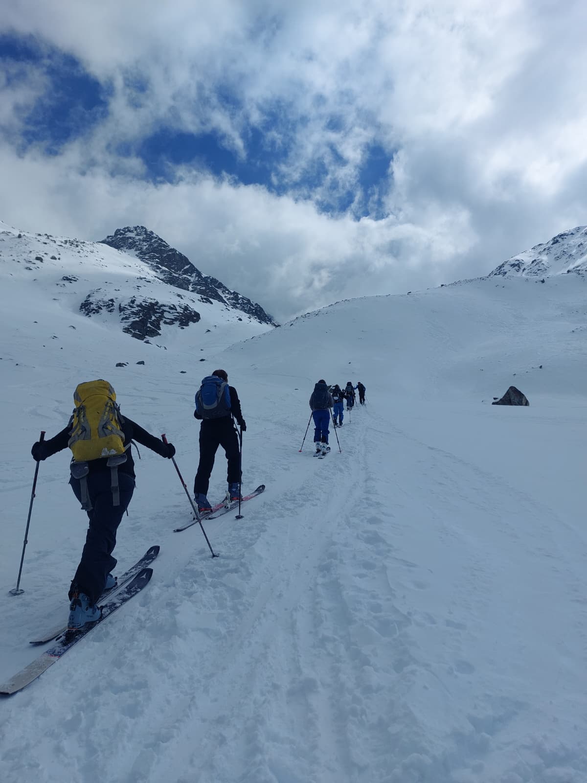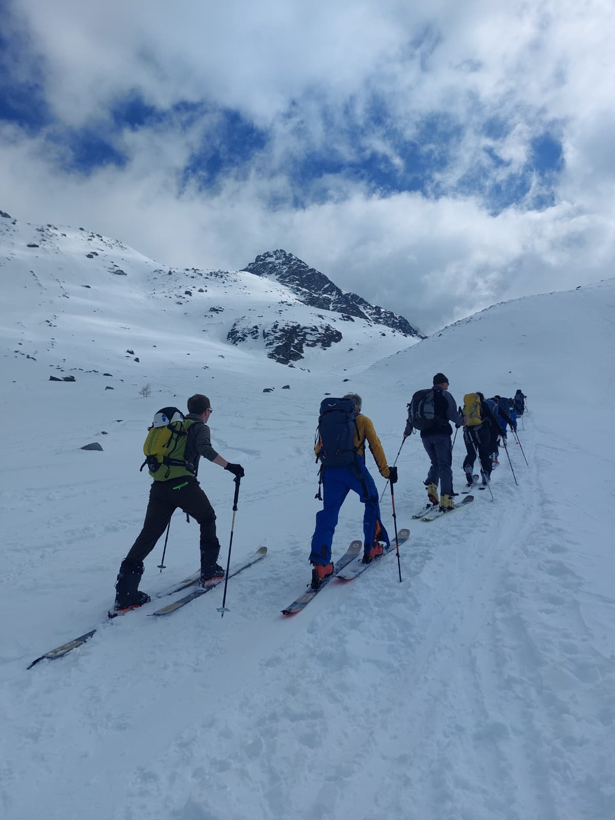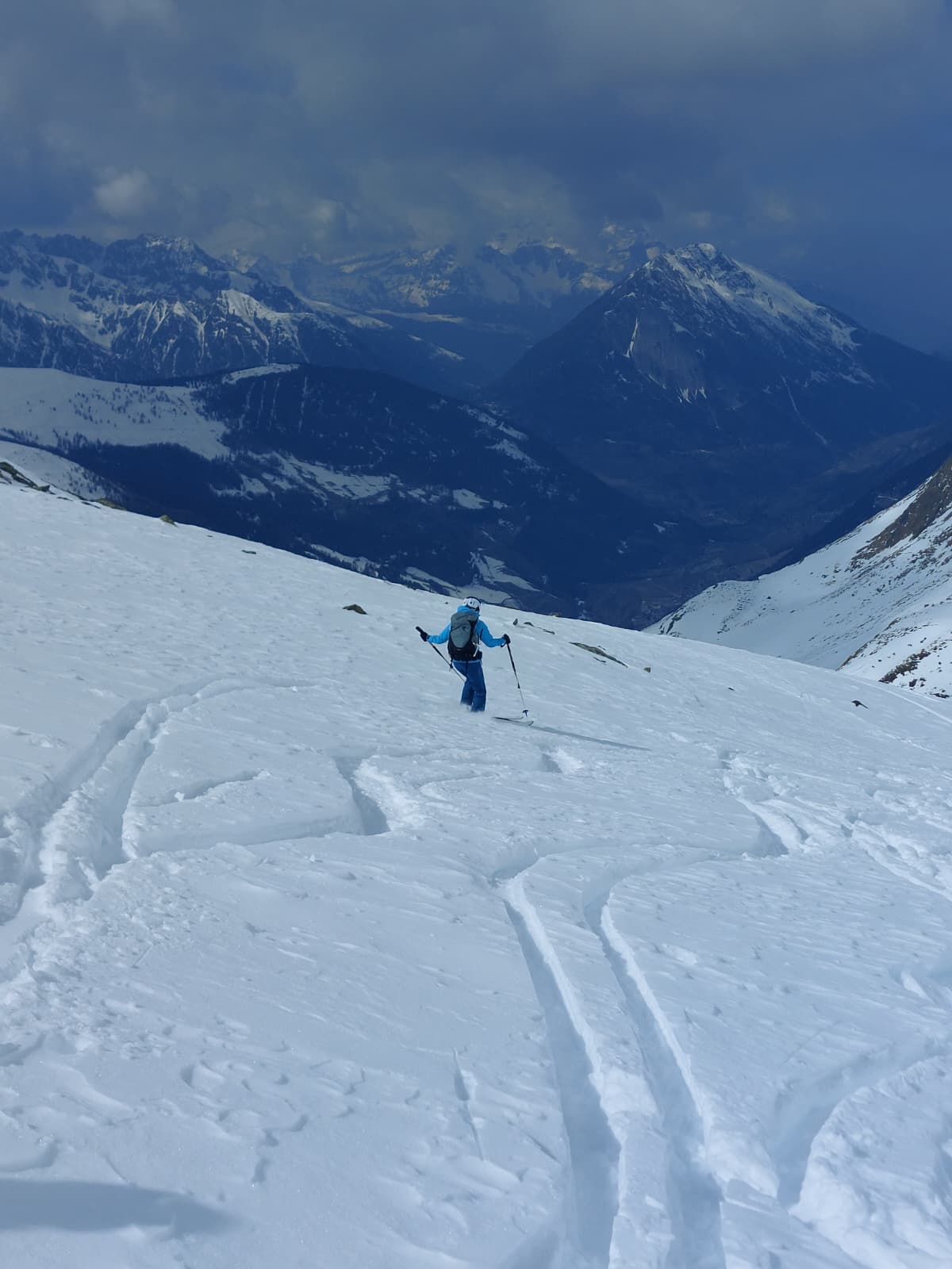 Le sommet du Beaufort est finalement atteint, bien mérité. On sort les thermos comme un trésor enfoui : le thé chaud coule , et soudain, tout le monde retrouve le moral et l’usage complet de ses jambes . Vient ensuite le moment de retirer les peaux… quand une fixation décide de nous rappeler qu’en montagne, rien n’est jamais totalement acquis. Heureusement, le télémark n’a aucun secret pour Daniel, qui transforme l’incident en démonstration improvisée. La descente se fait sur du carton, en compagnie de nos amis les « sharks », ces plaques de neige traîtres qui adorent tester notre équilibre.