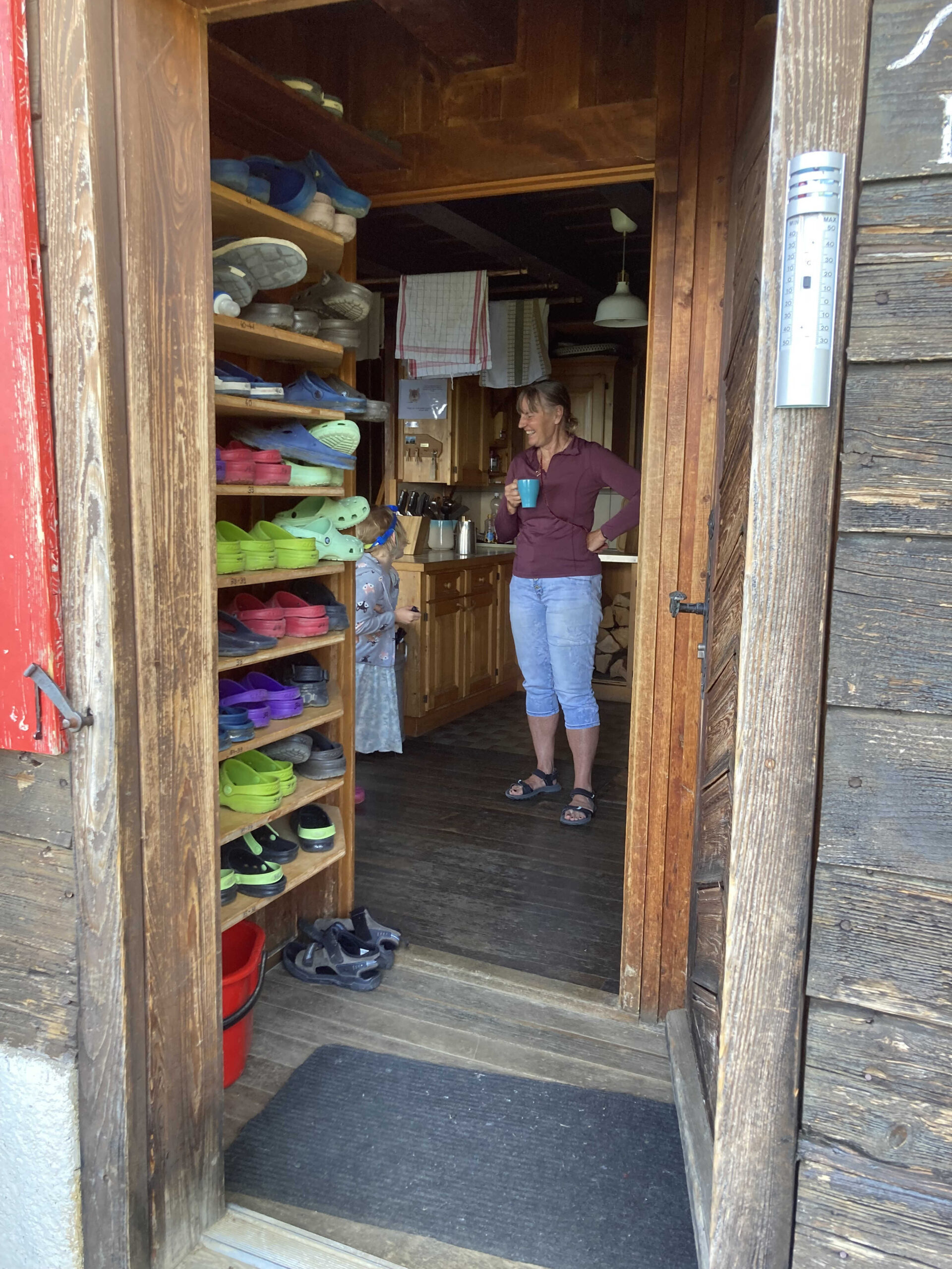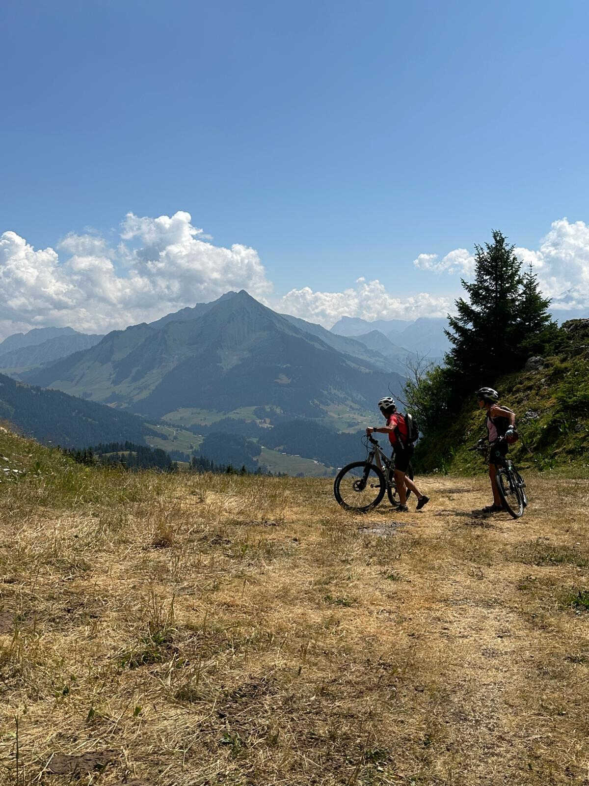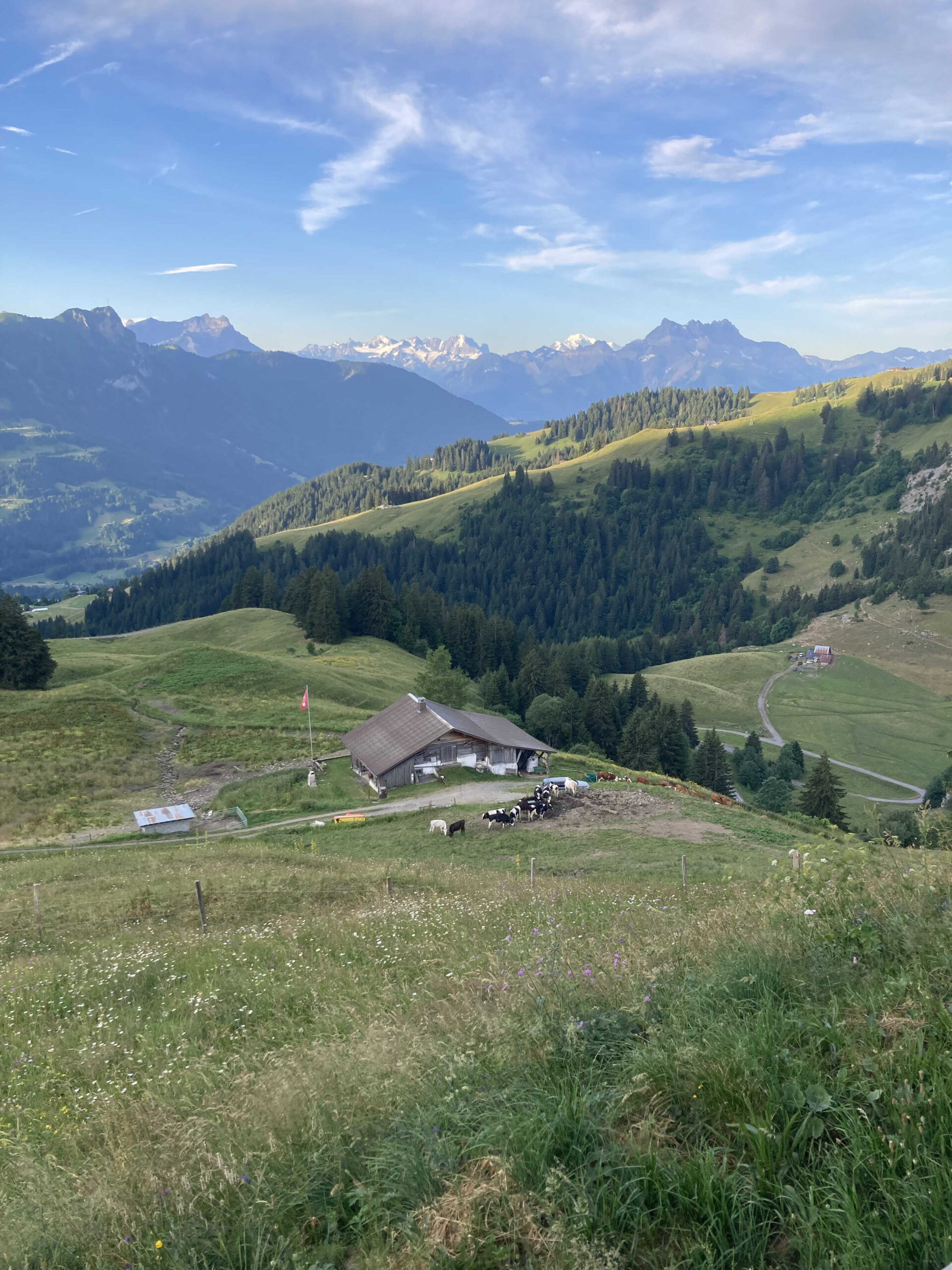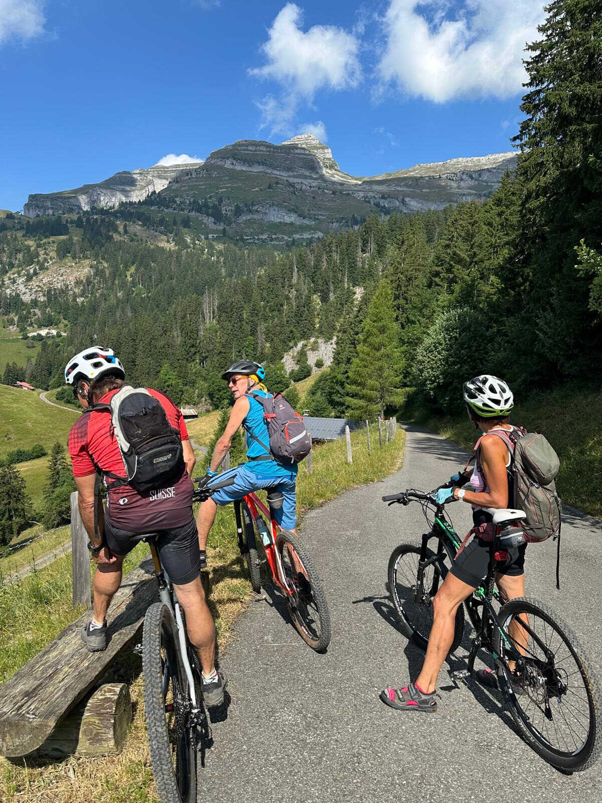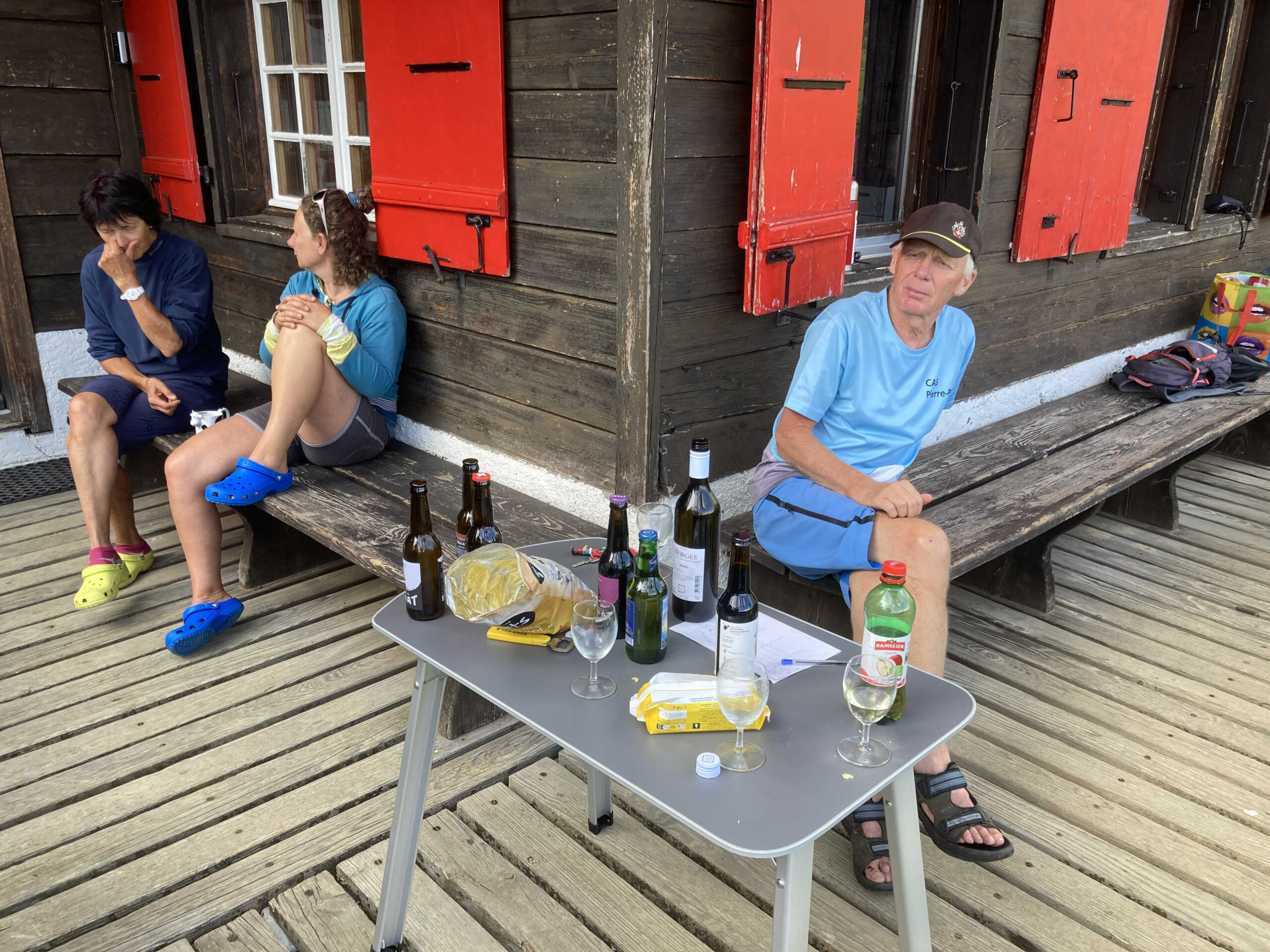 Il est situé à env. 1’600 m d’altitude, en haut d’un col. Dur pour les VTTistes qui terminent systématiquement leur sortie par env. 400 de D+. Heureusement, la source qui alimente le chalet n’est pas tarie et dispose d’une petite bassine en zinc qui permet des bains à la Rika Zaraï, des pédiluves ou autres débarbouillettes à la lavette. Chacun.e y trouve une solution d’ablution, pour admirer sereinement la vue depuis la terrasse du chalet en dégustant un apéro bien mérité. Oui, les activités en montagne, ça donne soif et le vin blanc de Morges ainsi que les bières locales JORAT sont appréciés. Et le paysage alpin s’élève devant nos yeux, nous rappelant d’autres escapades : Tour Famelon, Chamossaire, Dents du Midi, Mont d’Or, Miroir d’Argentine, Grand Muveran, Dent Favre…