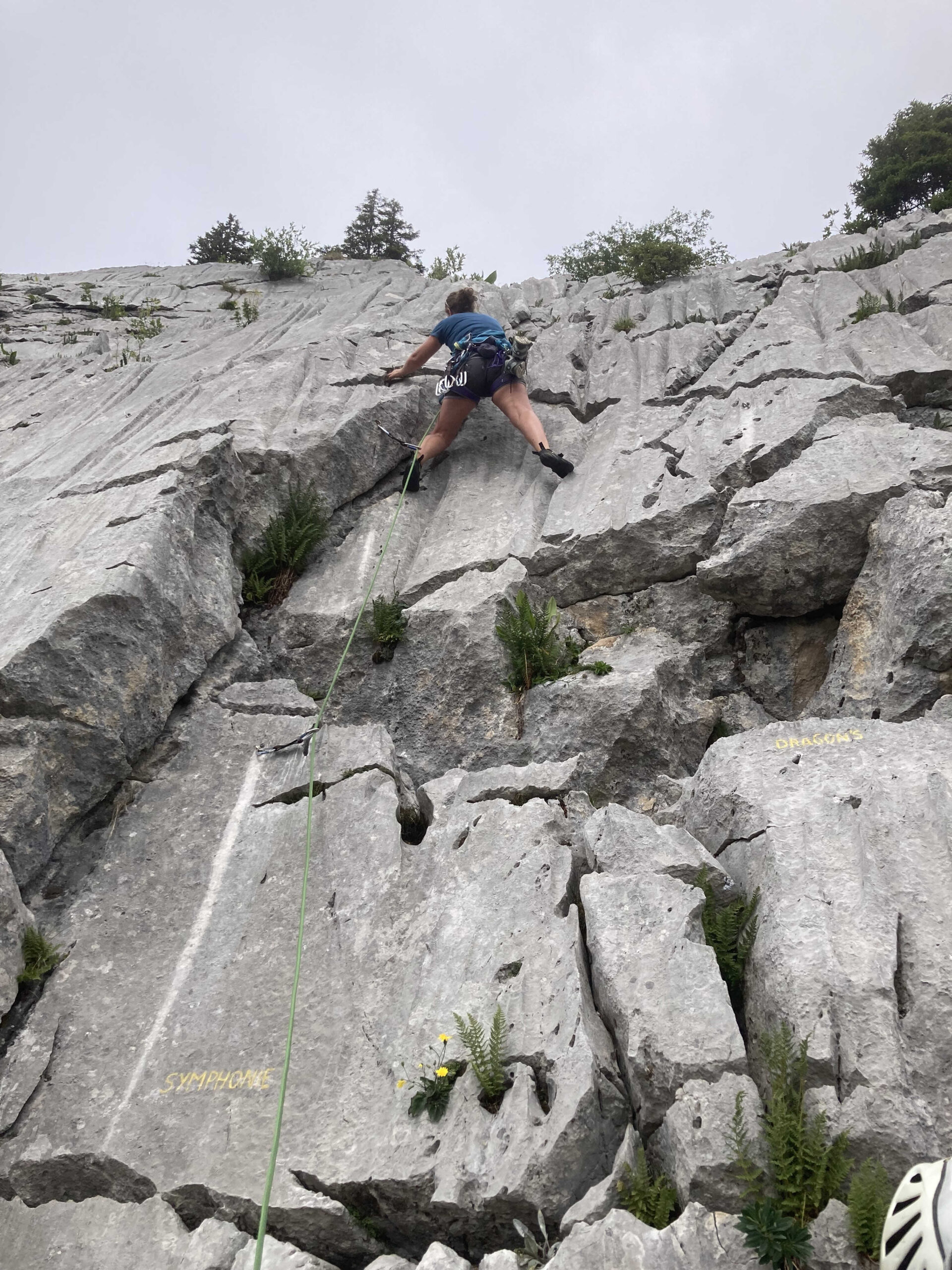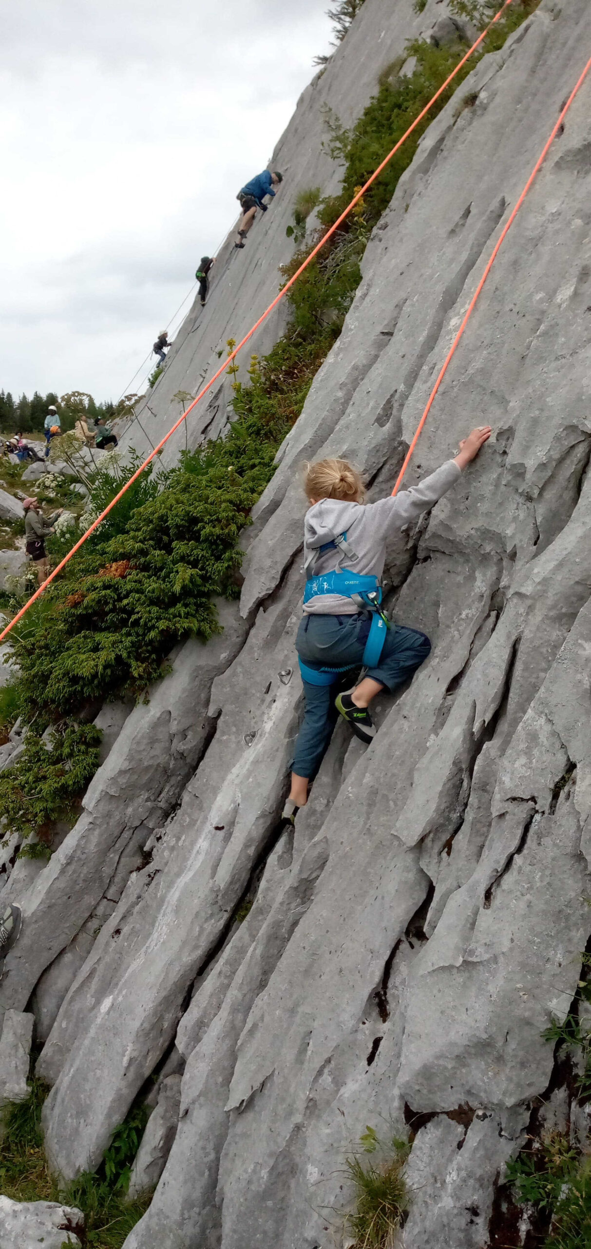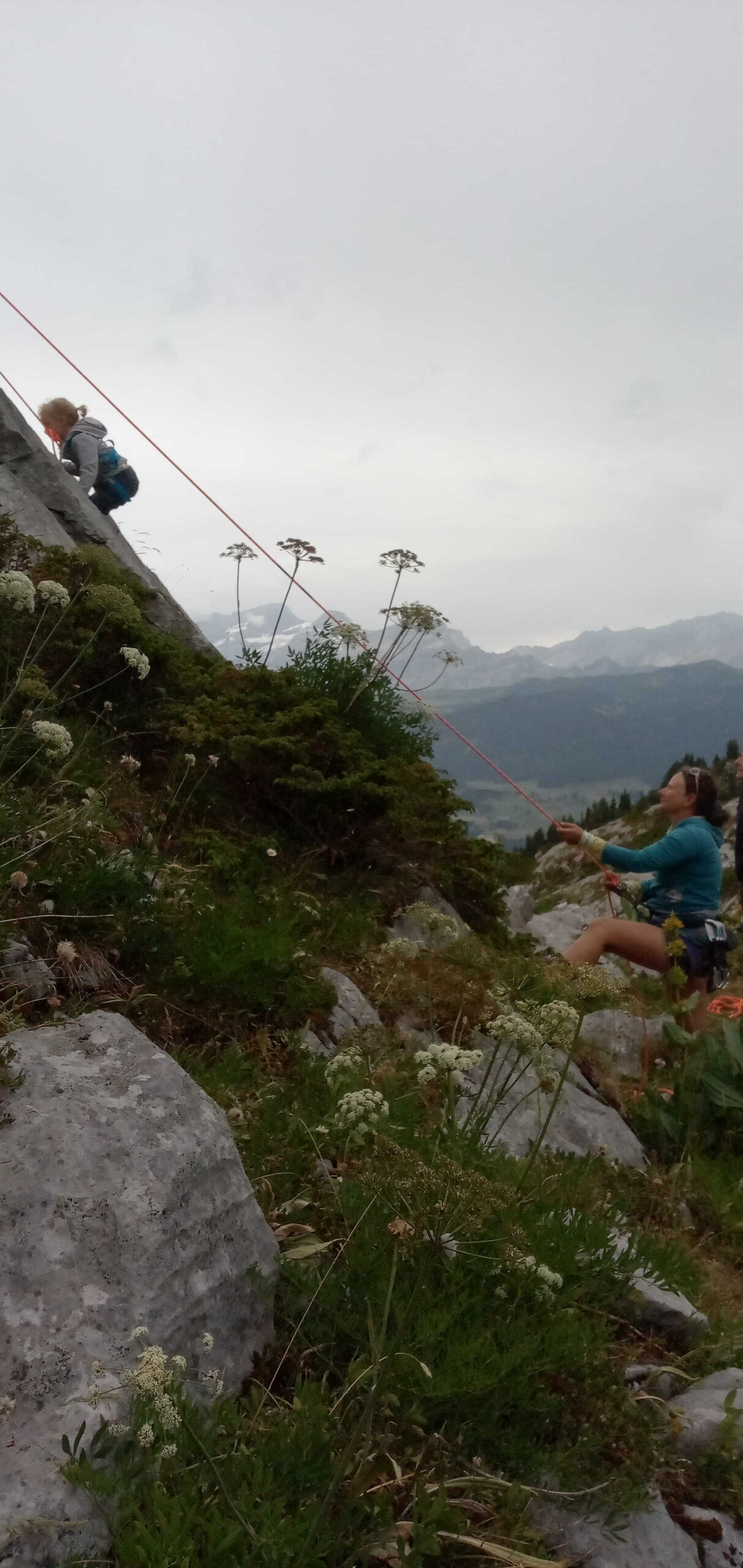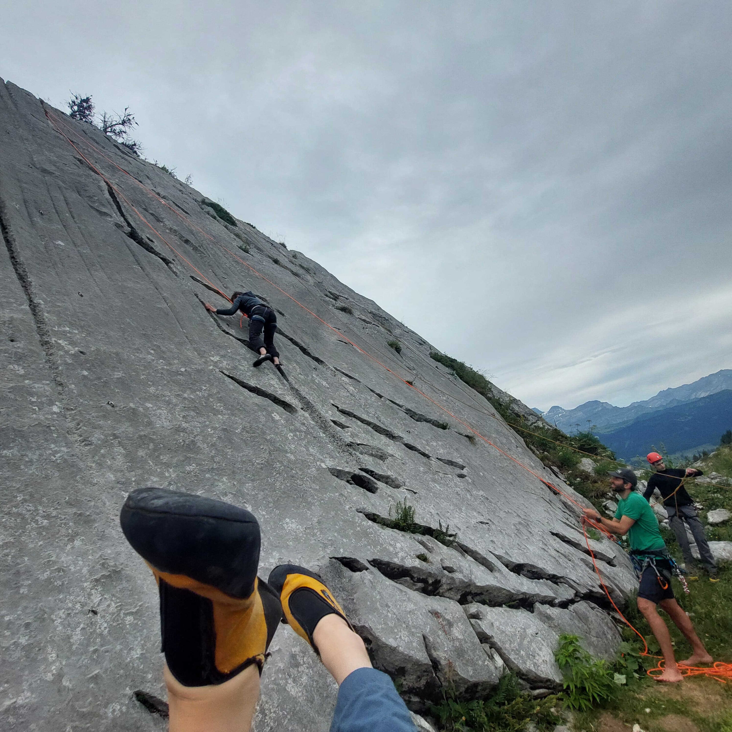 Le pique-nique justement ! Un moment sacré au pied de la paroi, où même les fromages se sentaient un peu plus courageux avant le retour à la verticale. Ressourcés, nous sommes repartis à l’assaut jusqu’à ce que la pluie, jalouse de notre enthousiasme, décide de manifester sa présence… avec cette douce délicatesse qu’on lui connaît (« coucou les grimpeurs, c’est l’heure de rentrer ! »).