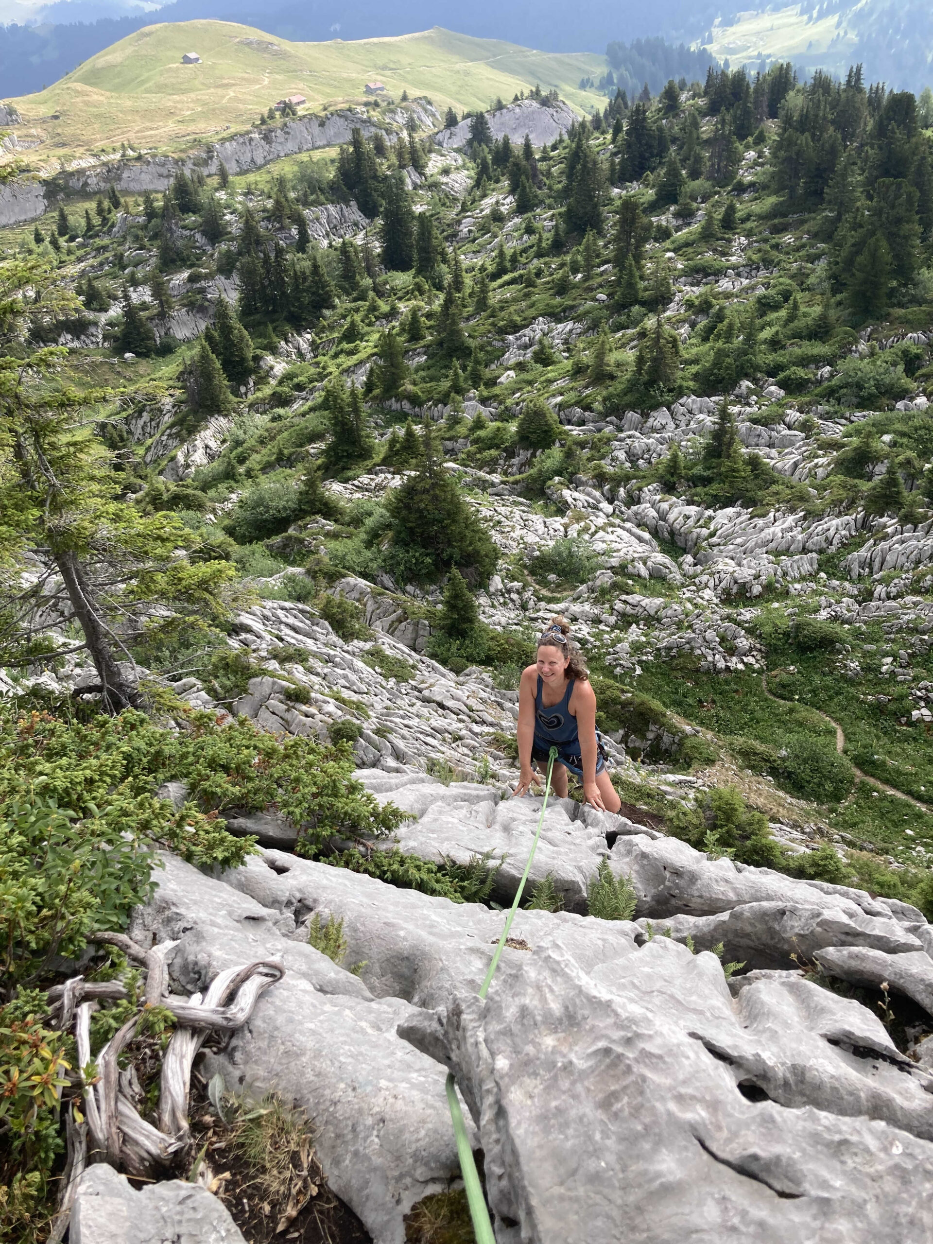 Seul Jeff s’annonce partant pour une longue voie, nous ferons une cordée de 3 en ligne. Carine part en tête dans « Symphonie ». Dans la partie supérieure -sur le topo- la voie devait tirer à droite, mais il n’y avait pas de spits. C’est donc à gauche que ça continue (?) … les derniers mètres passent par un petit toit à grosses prises, étrange au milieu de ces dalles. Un vent du nord nous annonce un changement de temps, nous ne nous attardons pas au sommet.