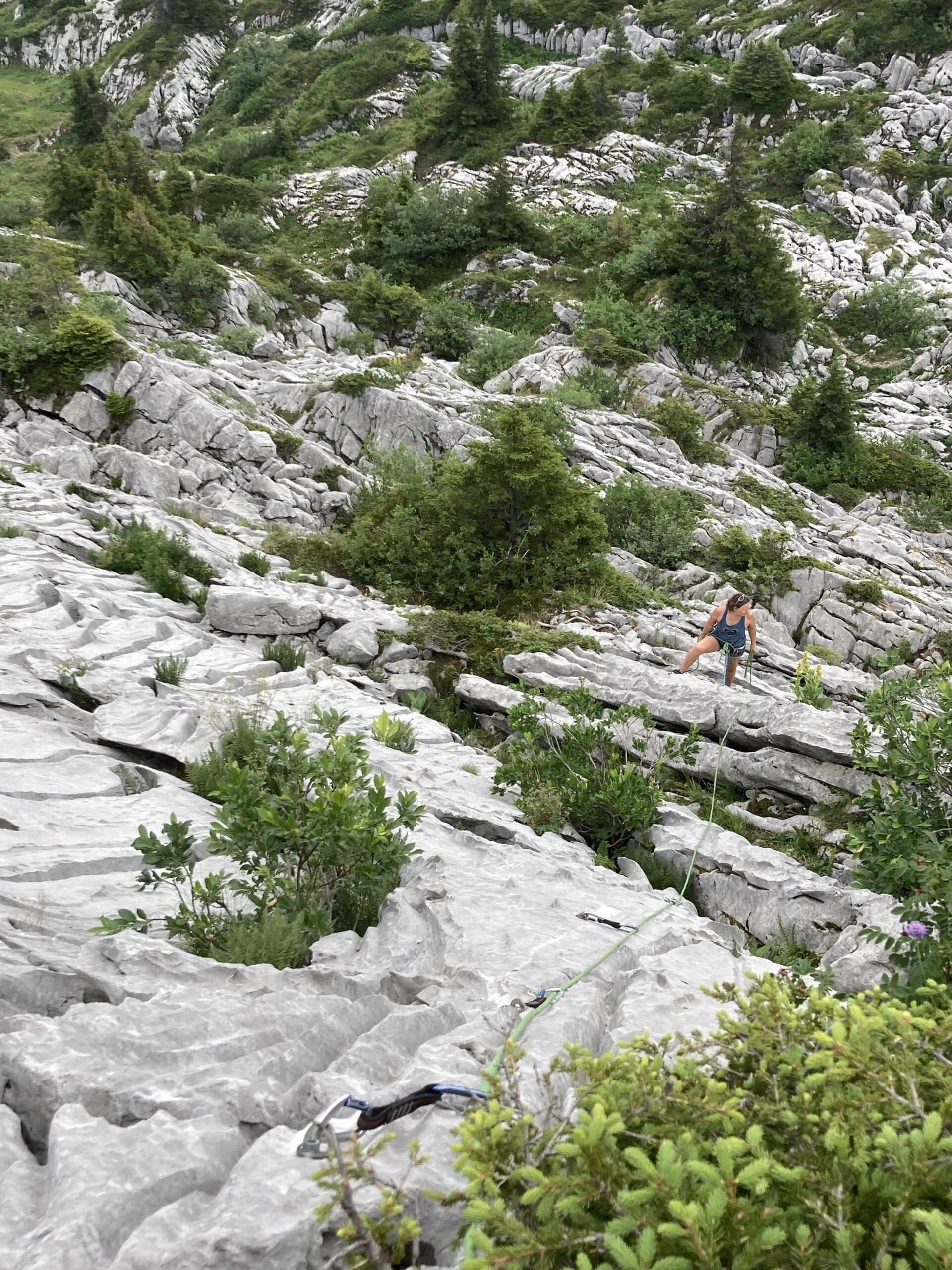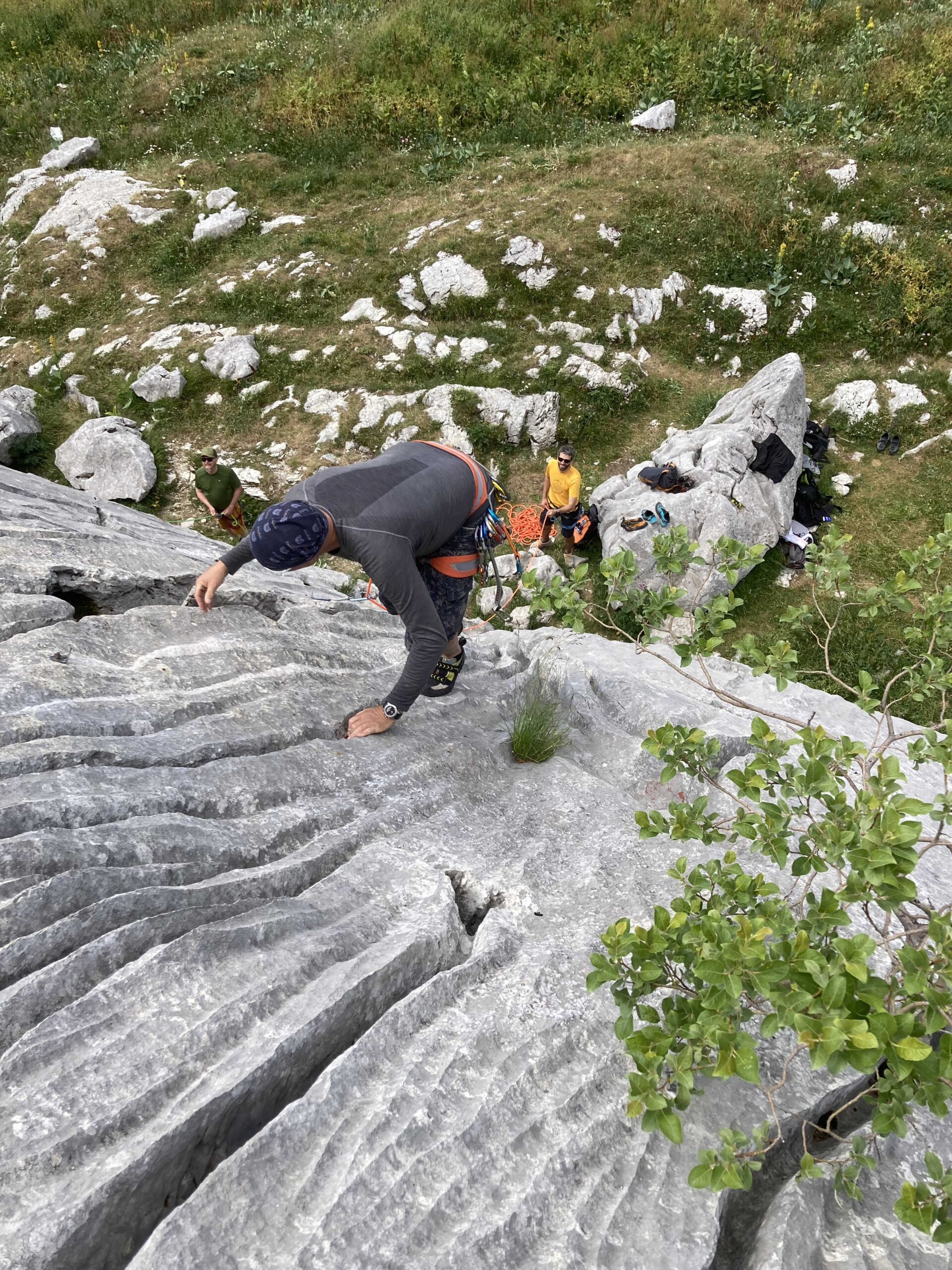 Nous choisissons la voie « Dragon » qui nous amène en quelques belles longueurs sur la crête sommitale. La descente annoncée sur les topos semblait logique pour nous ramener directement au pied des voies… en suivant des marques rouges peintes sur le lapiaz celles-ci nous éloignèrent du point à atteindre. Résultat il faut remonter le sentier d’accès pour aller rechercher nos sacs.