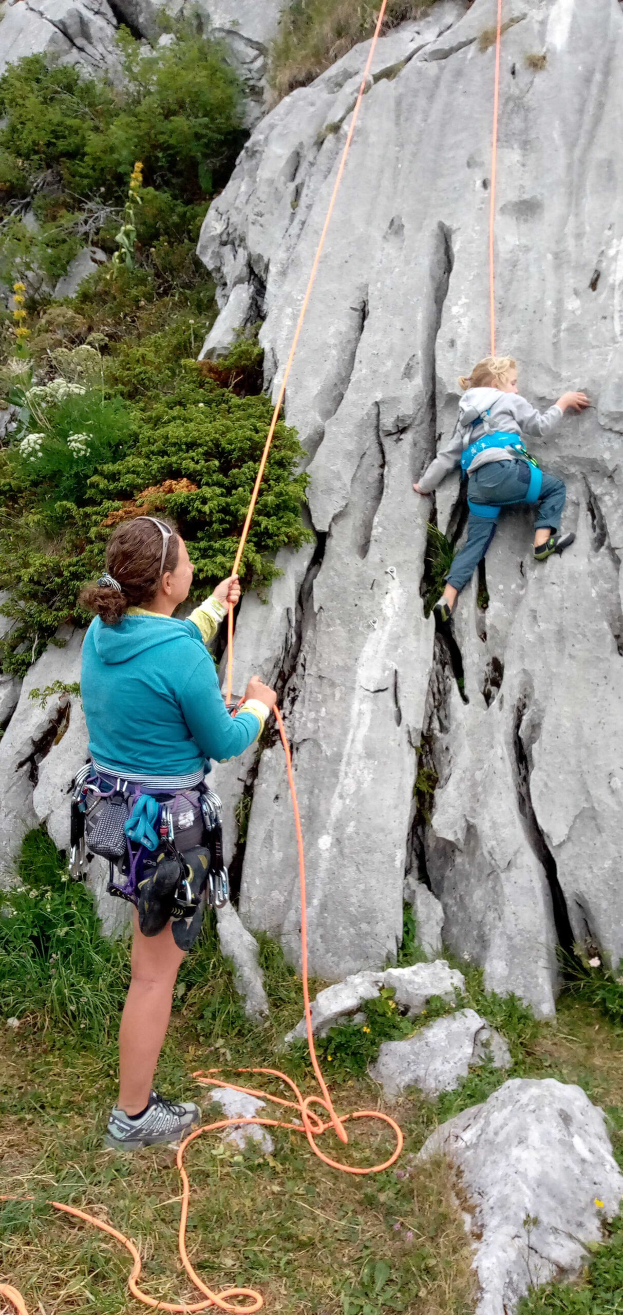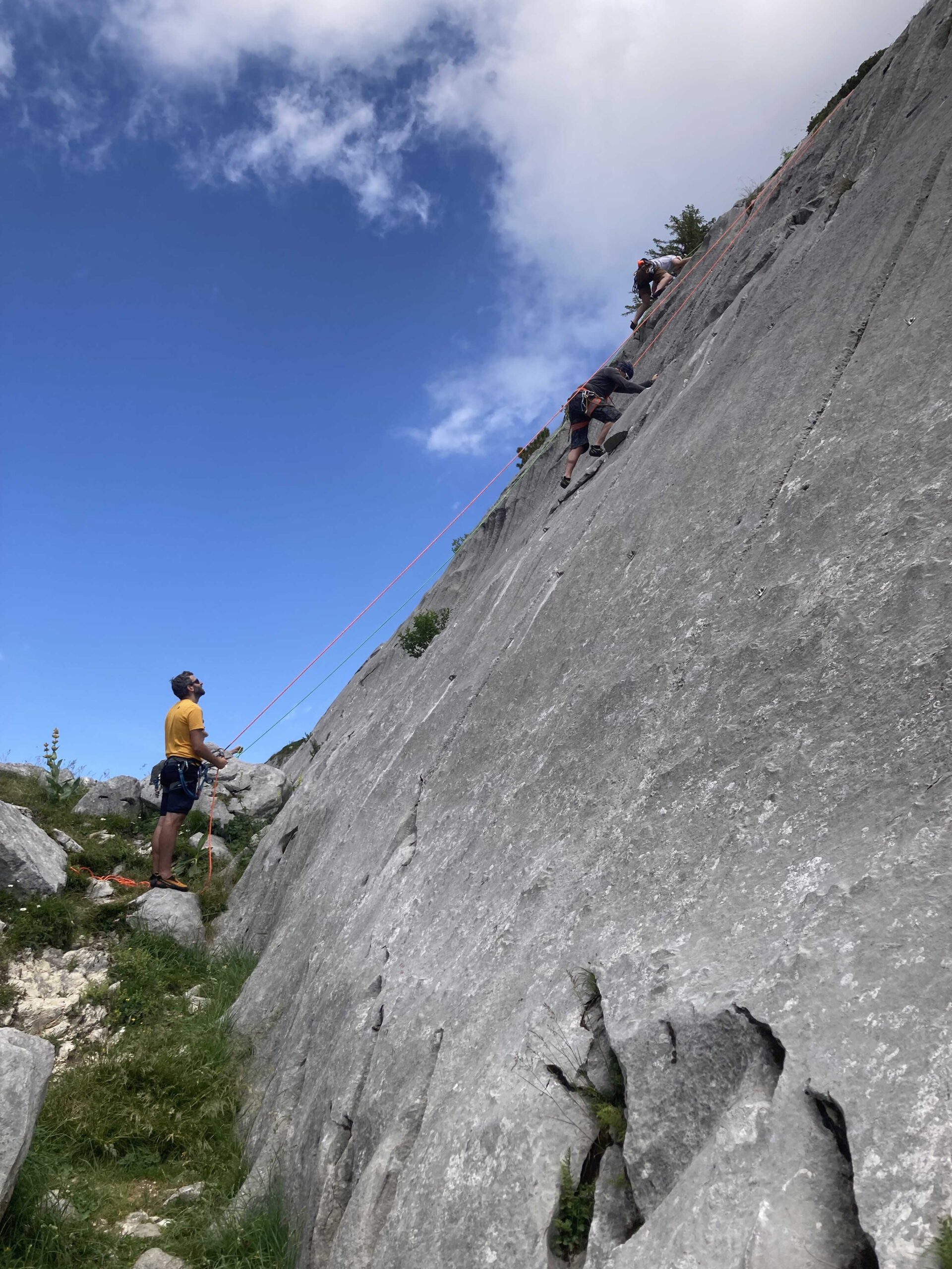 Arrivés enfin devant la belle paroi, les baudriers se sont mis à frétiller d’impatience. La séance de moulinette a vu grimper petits et grands, dans la joie et la bonne humeur, secteur « sourire obligatoire » garanti pour tous ! Pour les amateurs de sensations verticales, une longue voie a été conquise avant que Carine, Gigi et Jeff nous rejoignent, pile à l’heure pour encourager… et nous impressionner avec leur technique.
