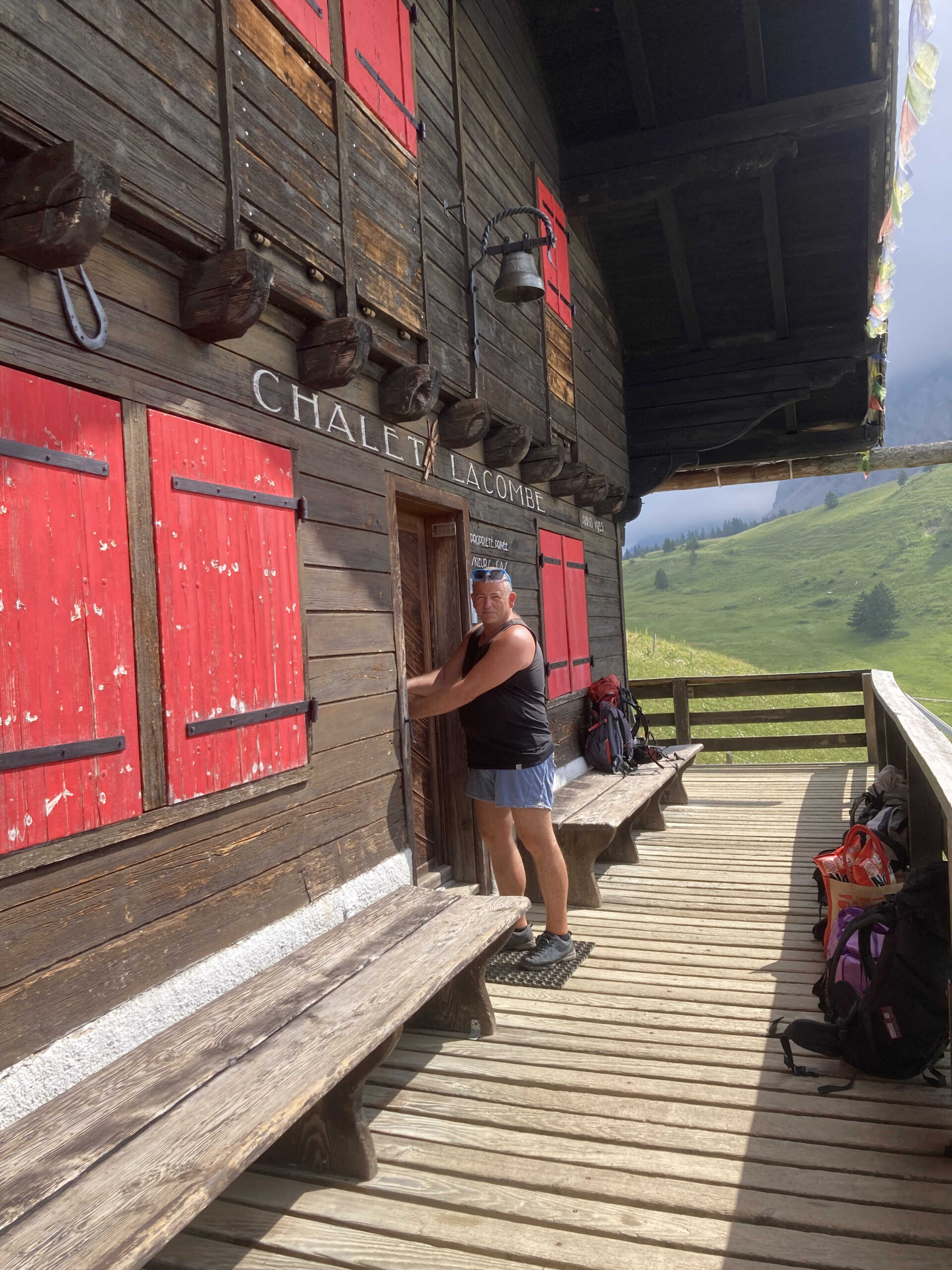 Nous immobilisons le bus sur la place de parc et, chargés comme des sherpas, nous rallions la cabane Lacombe en une dizaine de minutes. Quelle belle cabane, une authentique bâtisse en bois avec son toit de tavillons située sur ces hauts pâturages, sa terrasse offre une vue panoramique sur les majestueux sommets des alpes. Gigi récupère la clé dans le boîtier électronique et nous prenons possession des lieux. Ce havre de paix célèbre son centenaire cette année et les rénovations entreprises durant les vingt lustres n’ont apporté qu’un minimum de confort afin de préserver la rusticité du lieu. Au rez-de-chaussée, la cuisine avec son potager à bois et une cuisinière à gaz à deux feux ; un coin à manger avec deux tables ; deux WC et un lavabo et encore une petite salle avec tables et bancs. À l’étage, quatre dortoirs avec vingt-quatre couches confortables. Le premier local étant réservé exclusivement aux ronfleurs, Gigi en prend possession, fidèlement suivi par Carine, seule personne qui peut faire la sourde oreille au concerto de nuit. Par chance, il n’y a pas eu d’autres réservations si bien que nous disposons de la cabane entière pour notre groupe.
